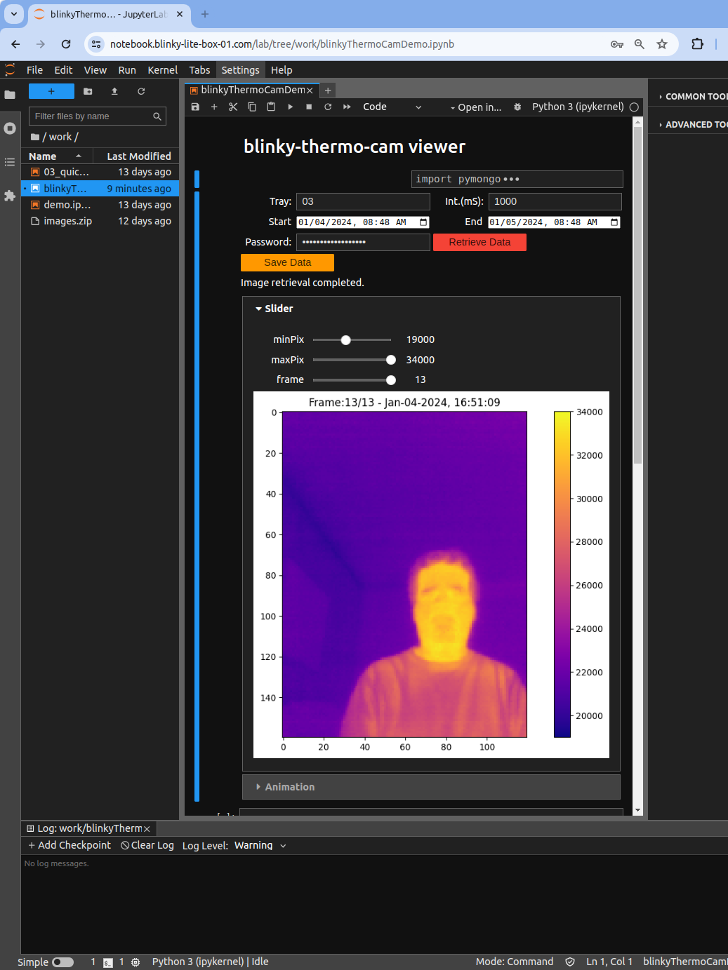 Since the Blinky-Lite framework uses MongoDB for storing data, integration into JupyterLab using PyMongo is straightforward. As an example, we integrated the Blinky-Thermo-Cam with JupyterLab. This integration could be used to develop deep-learning models for thermal imaging streams which could be useful in many diverse fields such as animal monitoring, chemical process monitoring, or equipment failure diagnosis.